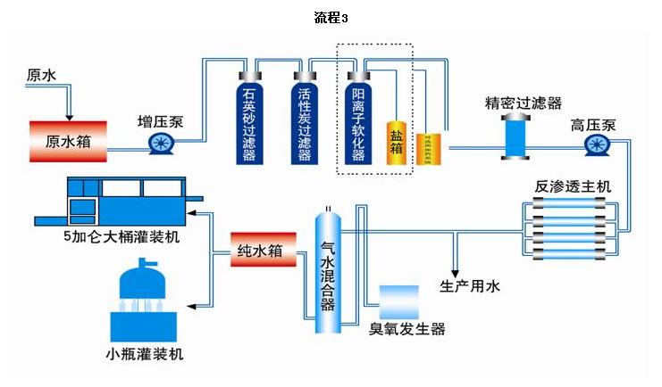 原水→原水箱→原水泵→多介質(zhì)過(guò)濾器(石英砂過(guò)濾器)→活性炭過(guò)濾器→軟水處理器→精密過(guò)濾器→高壓泵→一級(jí)反滲透(RO)裝置→純凈水箱→高壓泵→二級(jí)反滲透→紫外線(xiàn)裝置→用水點(diǎn)