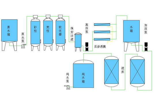 本系統根據客戶現有的情況而設計;為達到客戶指定之要求[出水5us/cm];要滿足廠內水產用水問題;特設計水處理設備選用RO反滲透純水水處理設備加提升來滿足貴廠