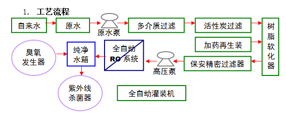 反滲透單元是本工藝的核心部分,由反滲透膜組件、高壓泵和清洗系統(tǒng)組成。反滲透單元主要是去除無(wú)機(jī)鹽、病毒和熱原物質(zhì),以使出水水質(zhì)達(dá)到純凈水標(biāo)準(zhǔn),系統(tǒng)脫鹽率高達(dá)98%以上。這是純凈水生產(chǎn)的核心部分,RO膜的孔徑為0.0001微米,經(jīng)預(yù)處理的水在高壓泵作用下通過(guò)RO膜,使水中所含98%以上的金屬離子、細(xì)菌、病毒等有害物質(zhì)被清除,制取可活化細(xì)胞、促使代謝的純凈飲用水(RO膜采用美國(guó)陶氏公司或海德能公司的產(chǎn)品)。