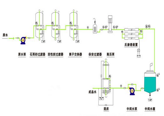 原水箱→原水泵→石英砂過(guò)濾器→活性炭過(guò)濾器→離子交換器→精密(保安)過(guò)濾器→反滲透高壓泵→反滲透→純水箱→純水泵→混床→DI離子水